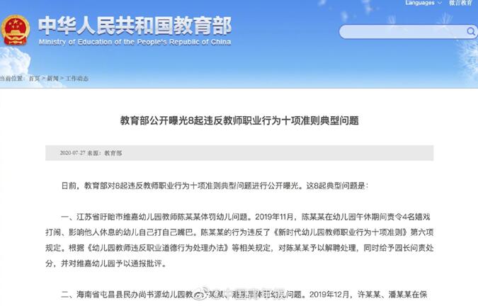 日前,教育部对8起违反教师职业行为十项准则典型问题进行公开曝光。其中包括江苏省盱眙维嘉幼儿园教师陈某某体罚幼儿问题。福州大学实验师张某某性骚扰员工、受贿问题等。#教育部公开8起教师违规典型案例# # 对违反教师职业准则行为保持高压态势#