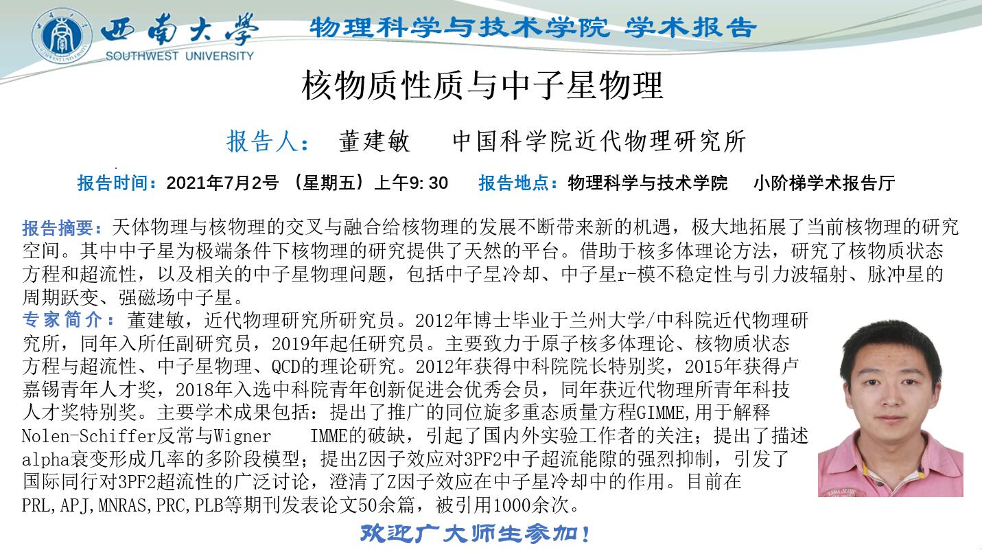 学术报告:核物质性质与中子星物理(7月2日)