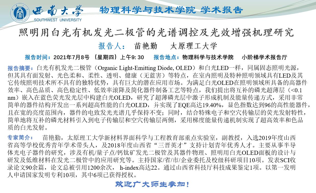 学术报告:照明用白光有机发光二极管的光谱调控及光效增强机理研究(7月8日)