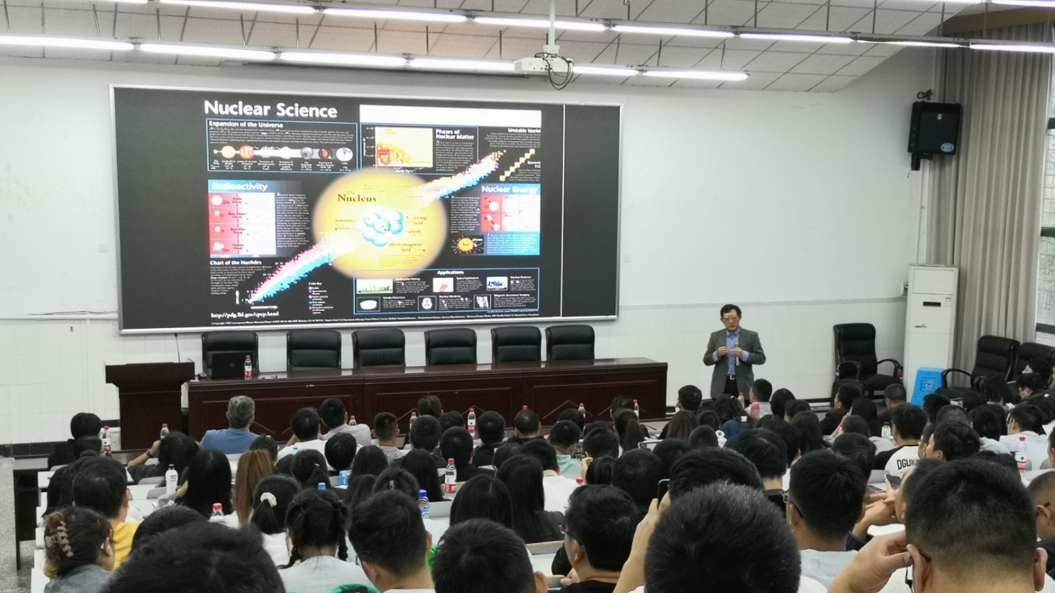 孟杰教授还特别介绍了其所在的研究团队,在国际同行和科研组织的鼓舞下首次提出原子核手性的概念,并被世界各国证实。“横比同龄青年,纵比牛人当年”,孟杰教授以亲身经历鼓舞同学们争做各行各业的佼佼者,他诙谐幽默的讲述开拓了大家的眼界,激发了同学们对于物理研究的兴趣和思考。
