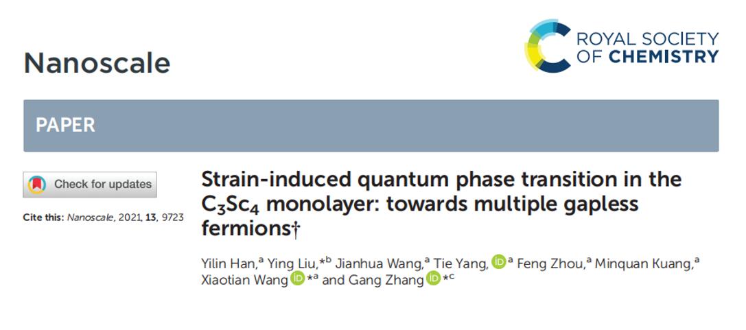 (3)Nanoscale,13,9723 (2021)论文的第一作者为公司本科生韩依琳和河北工业大学刘影博士,通讯作者为公司王啸天副教授和新加坡科技局张刚教授。我们通过应力作用发现在二维层状材料中的可以实现多种“零能隙”的费米态转变,并对其深层物理机制展开研究。