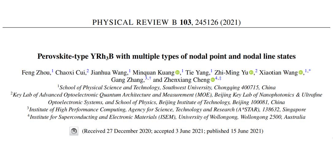 (2)Phys. Rev. B 103,245126 (2021)论文的第一作者为公司研究生周凤,通讯作者为公司王啸天副教授、新加坡科技局张刚教授、澳大利亚伍伦贡大学程振祥教授。我们提出了YRh3B中奇特的多种节点和节线共存特征,并对其深层物理机制展开研究。