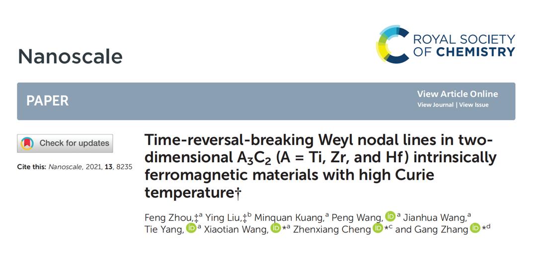 (4)Nanoscale,13,8235 (2021)论文的第一作者为公司研究生周凤和河北工业大学刘影博士,通讯作者为公司王啸天副教授、新加坡科技局张刚教授、澳大利亚伍伦贡大学程振祥教授。我们在高居里温度的A3C2层状材料中发现Time-reversal-breaking的外尔节线,并对其深层物理机制展开研究。
