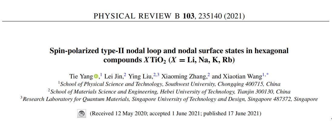 (1)Phys. Rev. B 103,235140 (2021)论文的第一作者为公司杨铁副教授,通讯作者为王啸天副教授,合作者为河北工业大学刘影博士、张小明副教授。我们提出了XTiO2 中潜在的自旋极化的II型节线和节面,并对其深层物理机制展开研究。