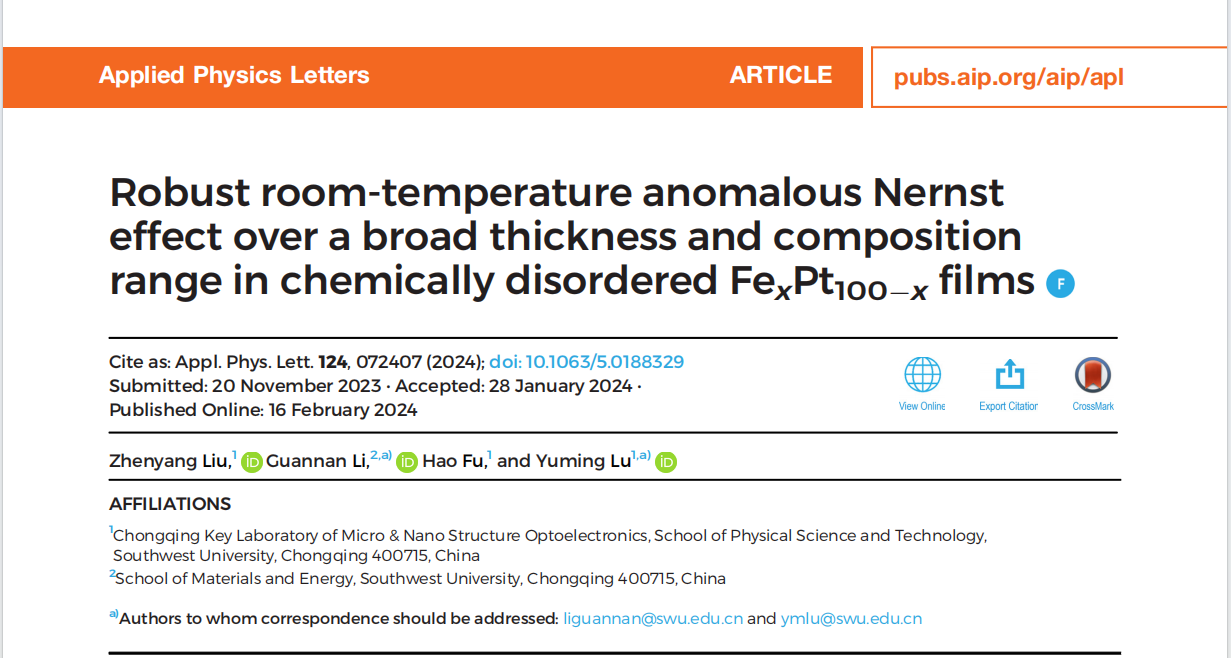 磁学与磁性材料是公司较早布局的研究方向之一。近日,公司新型磁性功能材料及器件团队卢玉明课题组在无序合金磁性薄膜反常能斯特效应领域取得新进展,相关成果以题为Robust room-temperature anomalous Nernst effect over a broad thickness and composition range in chemically disordered FexPt100-x films” 发表在自然指数期刊Applied Physics Letters》上,并被编辑部遴选为亮点论文“Featured article”(入选率约为10 %)。公司硕士研究生柳桢杨为论文的第一作者,卢玉明副教授为最后通讯作者,BEVITOR伟德为唯一完成单位。