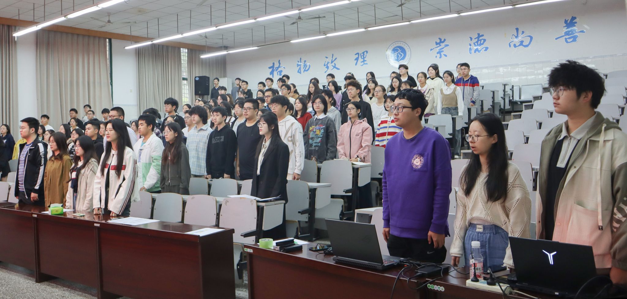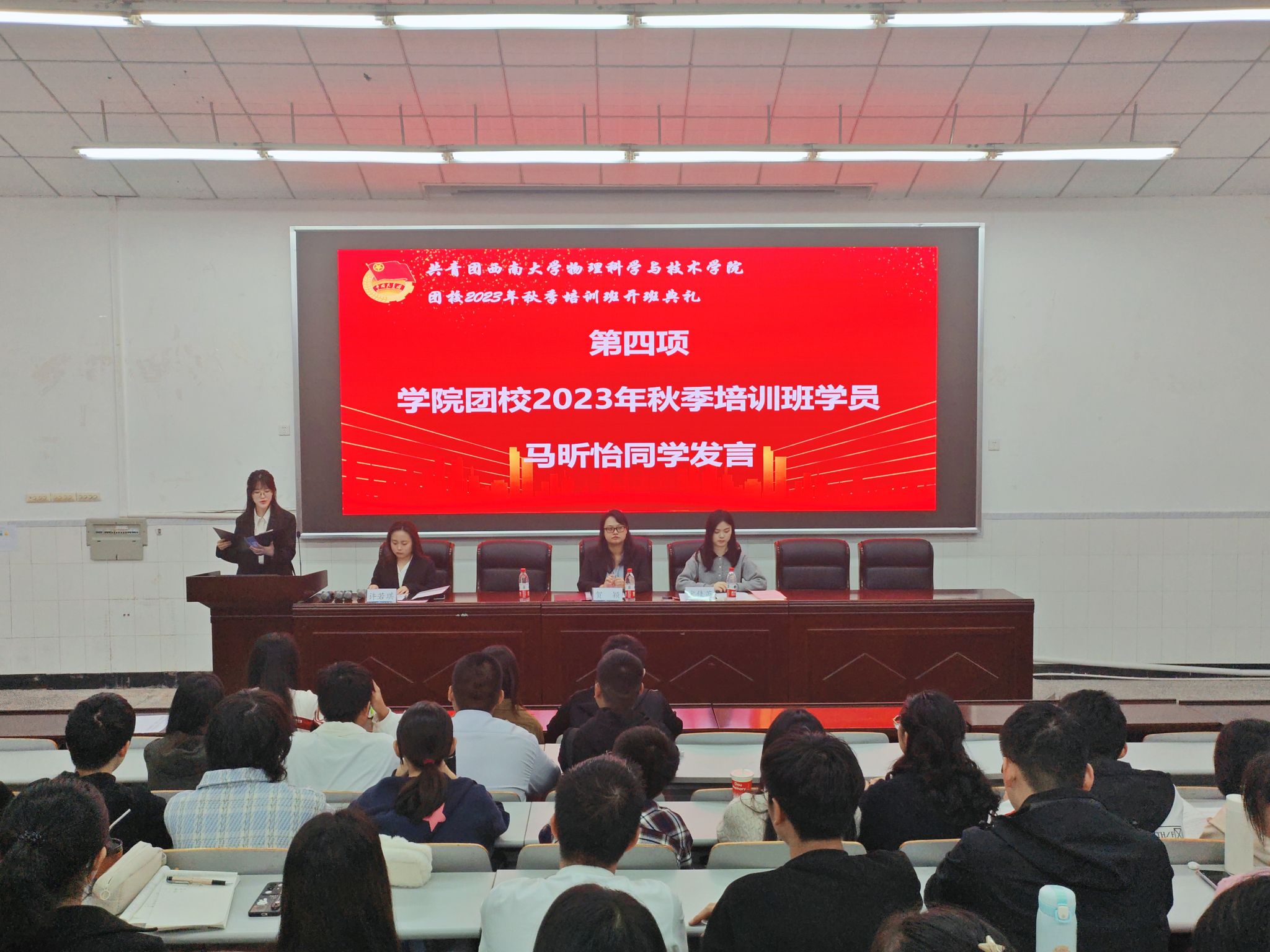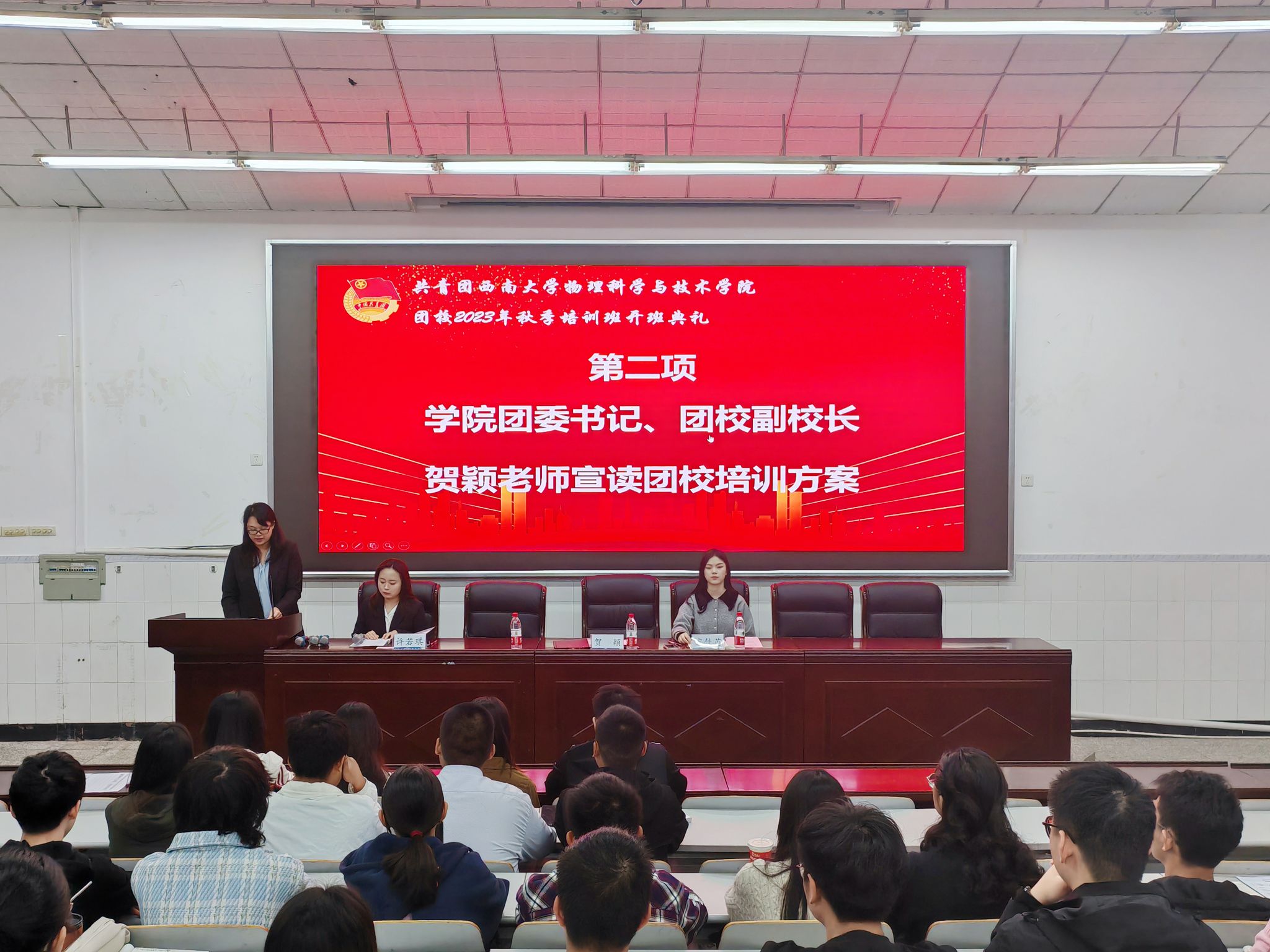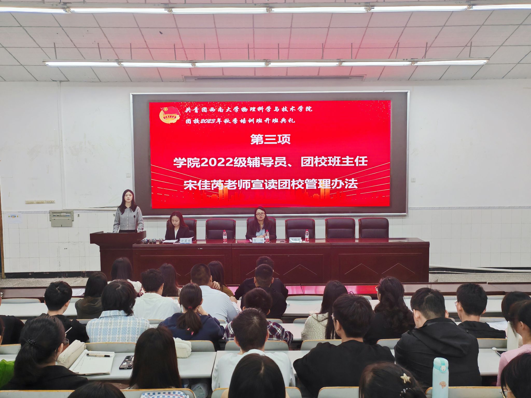2023年10月22日上午8点30分,团校开班典礼在物理大楼大阶梯教室举行。公司团委书记、团校副董事长贺颖,2022级辅导员、团校培训班班主任宋佳芮和100名参训学员参会。典礼由公司团委副书记、团校培训班班长许若琪主持。