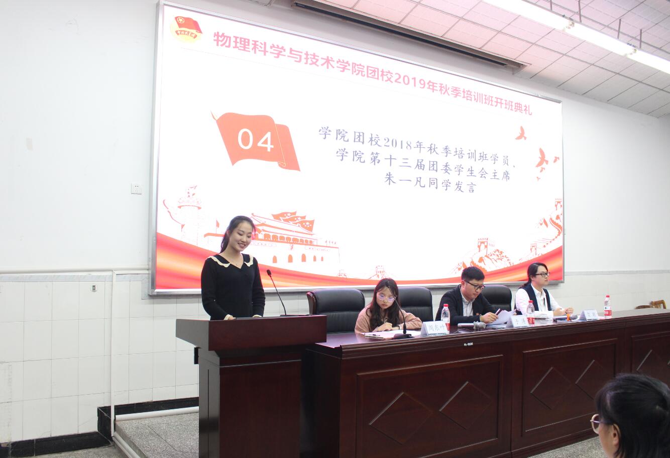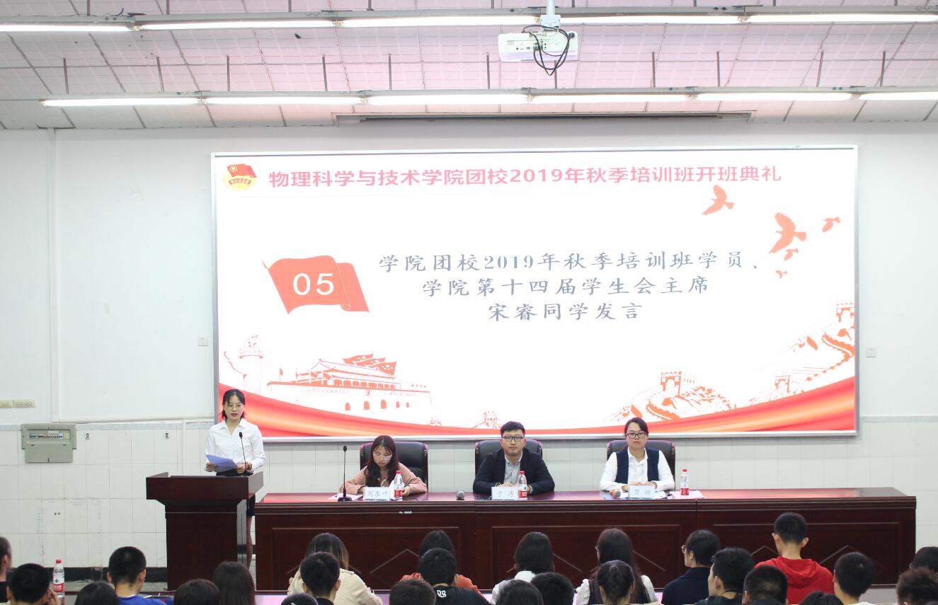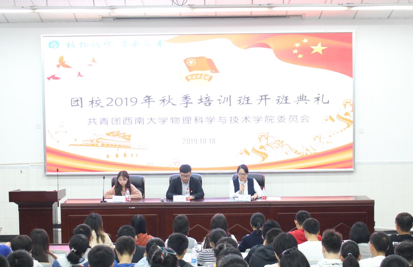 10月18日晚七点,团校开班典礼在物理大楼大阶梯教室举行。典礼由公司团委书记贺颖主持,校团委副书记于涛应邀出席,2019级辅导员周东叶参加了开班典礼。公司团委员工会、科普创作社以及2018级、2019级各个团支部推荐学员共计160名参训学员参会。