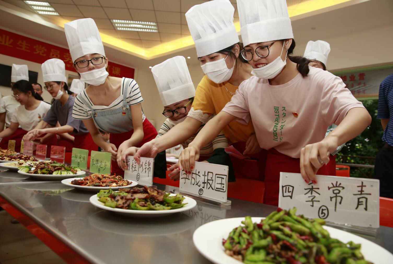 有了大厨带,毕业生们兴致特别高。刚看完师傅演示,就迫不及待开始了自己的表演。青春洋溢的老员工,戴着洁白的厨师帽和口罩,穿上酱红色的围裙,奔忙在亮锃锃的食堂后厨,叮叮当当奏起了锅碗瓢盆交响曲。