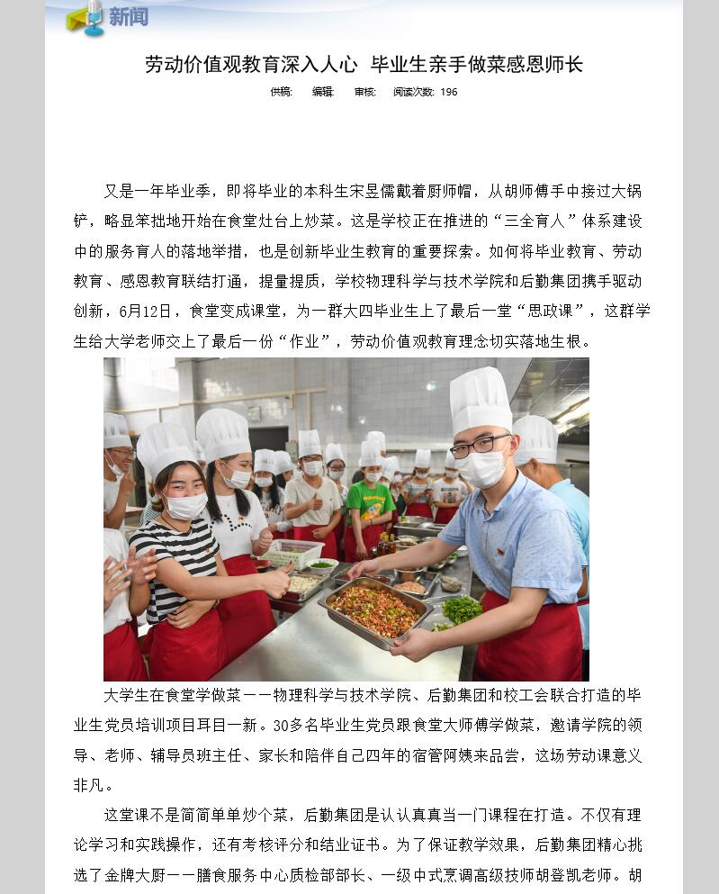 活动策划人之一、校工会副主席郑劲松则认为,老员工毕业前的最后一课“学做菜”,把感恩教育、劳动教育、毕业离校教育等融为一体,其实是全国教育大会所强调的“加强老员工劳动教育”的一次生动实践,是当年陶行知先生所主张的“生活即教育”理念的当代实践。