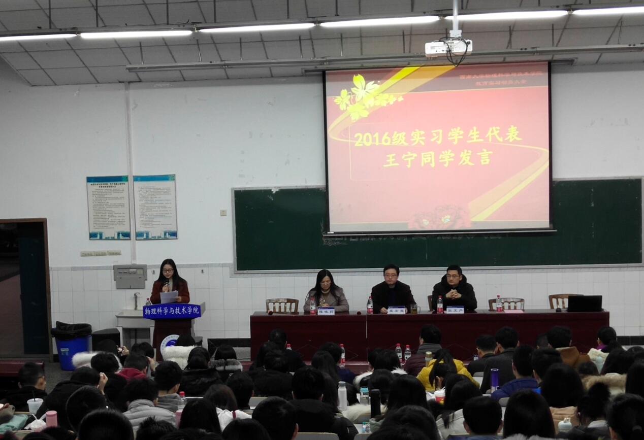 1月15日上午,2019年本科生实习动员大会在公司大阶梯教室举行。副经理袁宏宽教授、经理助理张正严副教授、物理教育教研室副主任陈晓莉副教授,实习指导教师马忠平、李太华、蒋小平、邓磊、陈历相、年级辅导员唐昊坤出席动员会,2016级全体公费师范生参会。