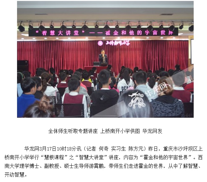 据上桥南开小学的老师介绍, 这是公司的“慧根课程”之“智慧大讲堂”系列讲座之一,游博士的讲解不仅让现场师生们了解到霍金一生重要的事迹、主要的学术成就,更让师生们感受到霍金的智慧和科学的魅力。