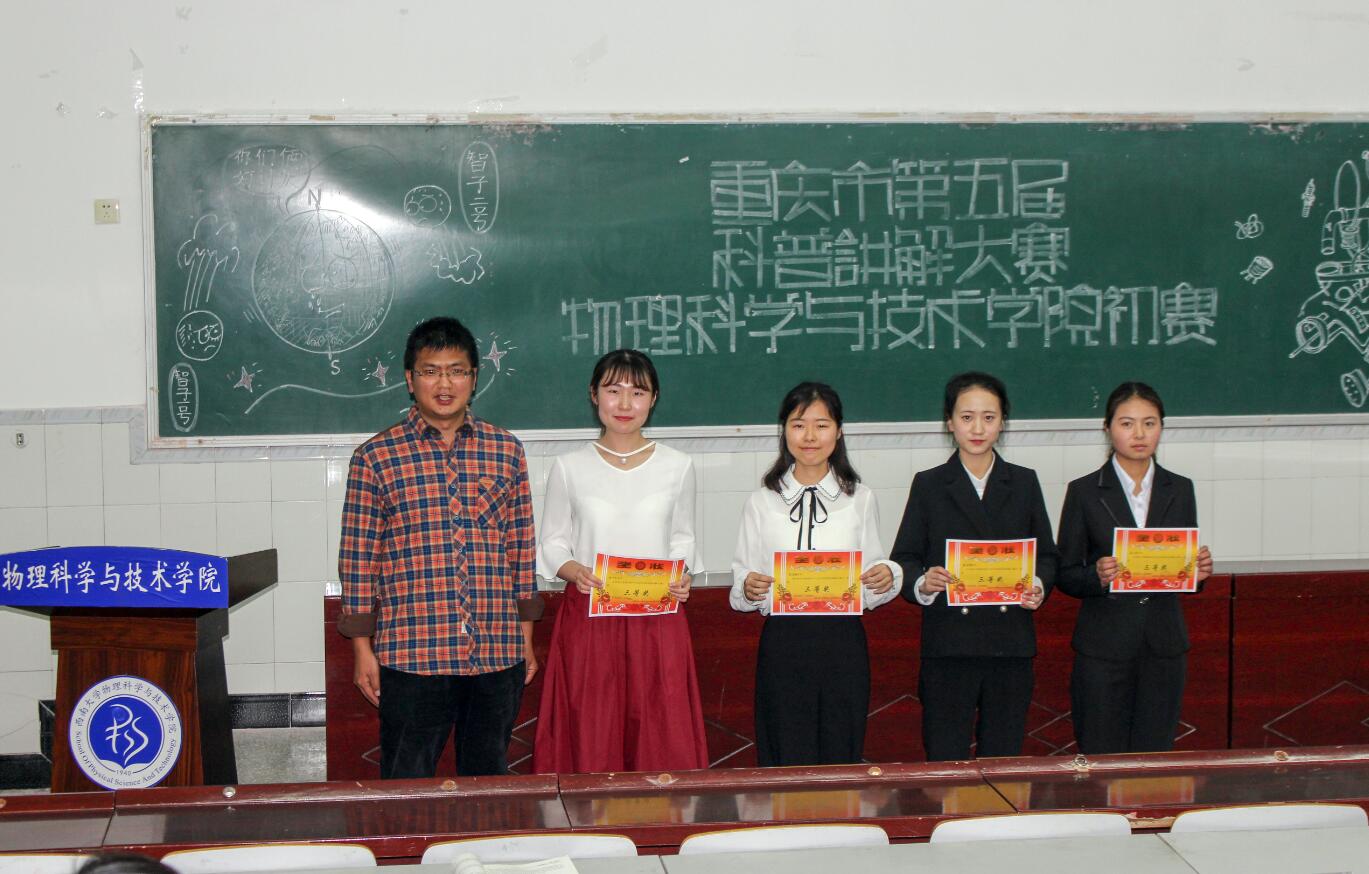 经过激烈的角逐, 2017级2班刘潇涵、2017级物理学班董思佳荣获一等奖;2016级物理学班朱一凡等三名同学获二等奖;2015级普师班邢玉陟等四名同学获三等奖;2016级4班,2017级4班获优秀组织奖。刘潇涵、董思佳、朱一凡、周晓涵四名同学将代表公司参加北碚赛区比赛。