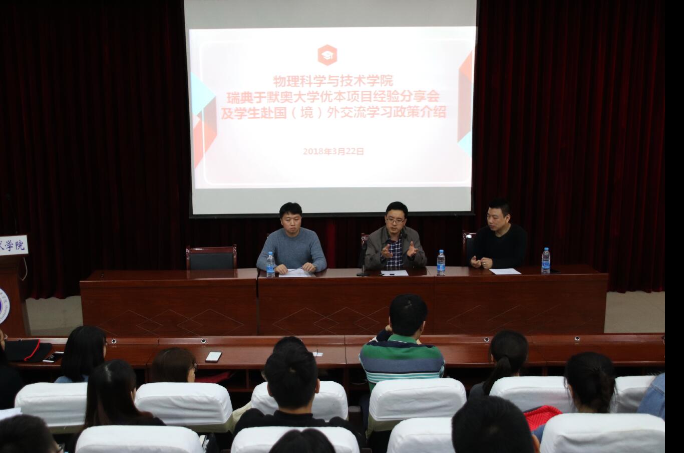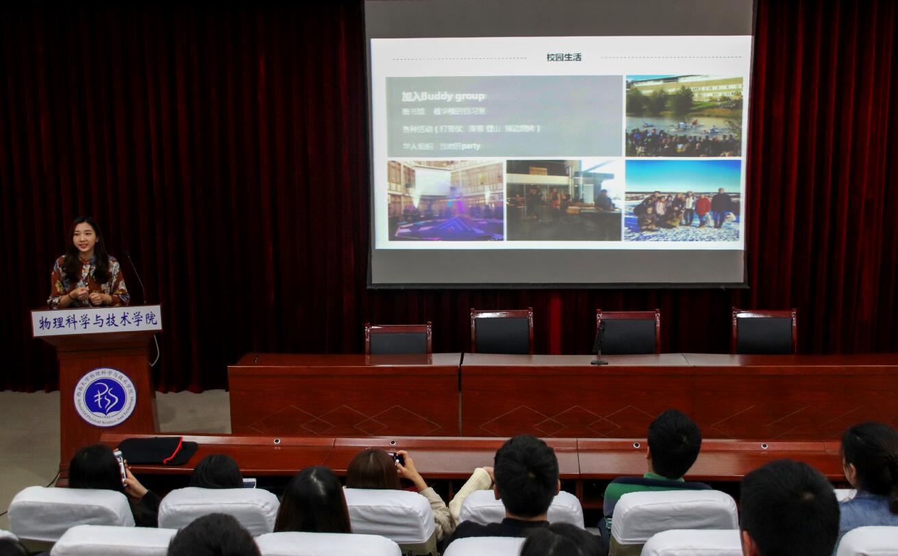 2014级员工杨双溢、辜丽叶就瑞典于默奥大学交换项目进行了经验分享。两位同学从专业学习介绍了相关物理实验操作、实验器材的运用,从风土人情方面介绍了瑞典的地方风情和风貌,引起了大家浓厚的兴趣。在互动交流环节中,同学们踊跃提问,咨询了托福、雅思等相关具体问题,老师们一一进行了详细解答,并提醒有留学意向的同学提前做好准备。