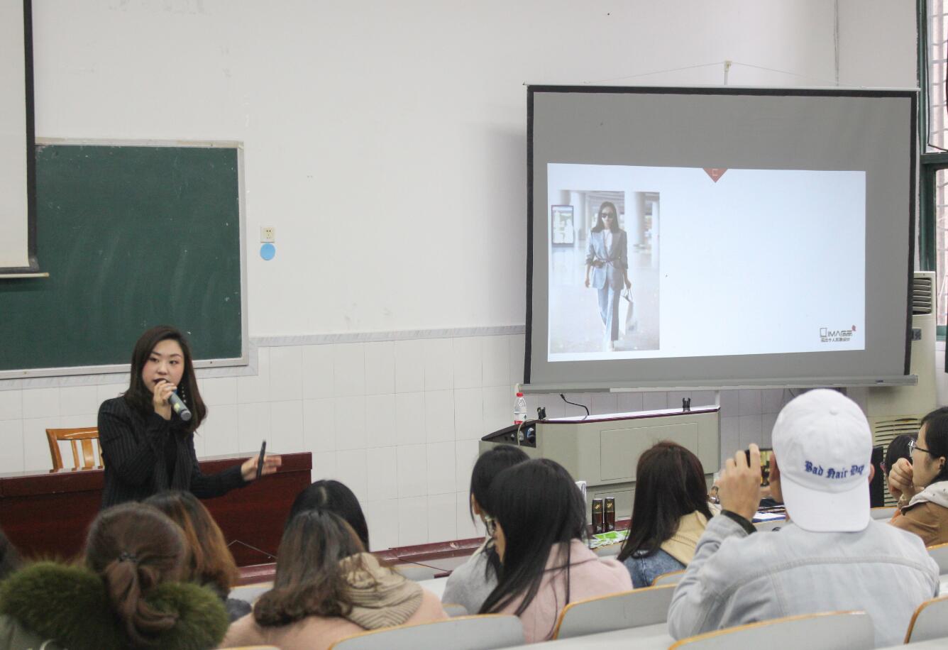 讲座以“从女神节开始做精致女神” 为题,探讨女性形象管理艺术。周老师首先以今年的流行色紫色为例介绍了时尚趋势潮流的变化,以赵丽颖、范冰冰和刘诗诗等明星为例,探讨了多种服装风格的搭配技巧。随后,详细介绍如何判断自己的脸型,分析不同脸型适合的妆容和发型。老师耐心讲解,听众积极讨论,欢声笑语充满了整个课堂。现场还邀请两位同学上台示范演示,设置了三次抽奖送礼品环节。