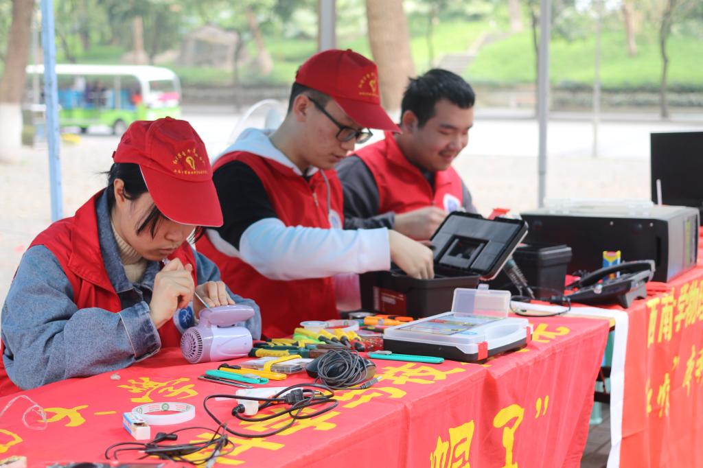 万用表,电烙铁,螺丝刀,剥线器,胶枪,热熔胶……,bevitor伟德员工向爱玲带着一大包工具,来到了公司北区樟树林,与“红帽子”青年志愿者服务队的小伙伴汇合后,开始摆摊迎接前来维修家电的师生。