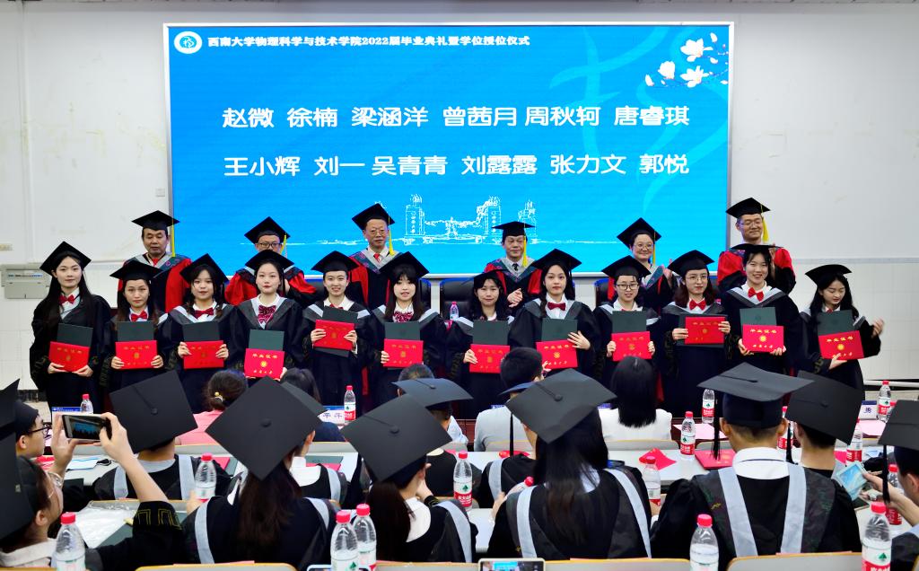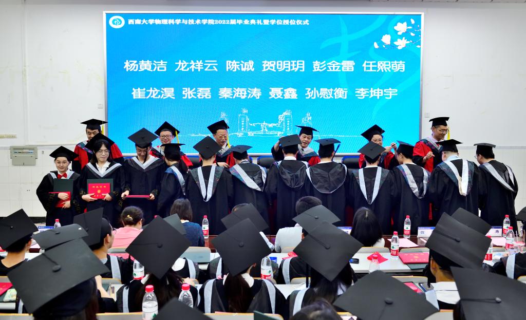物理学专业苏航同学代表毕业本科生发言,感叹“西大真的很大”,从一开始迷失方向,到愈挫愈勇中不断找到方向。苏航同学结合自身四年发展分享了自己的心得:“尝试和目标”“专注和踏实”“务实和爱国”,希望未来努力成为“功成不必在我,但功成必定有我”的物理人。