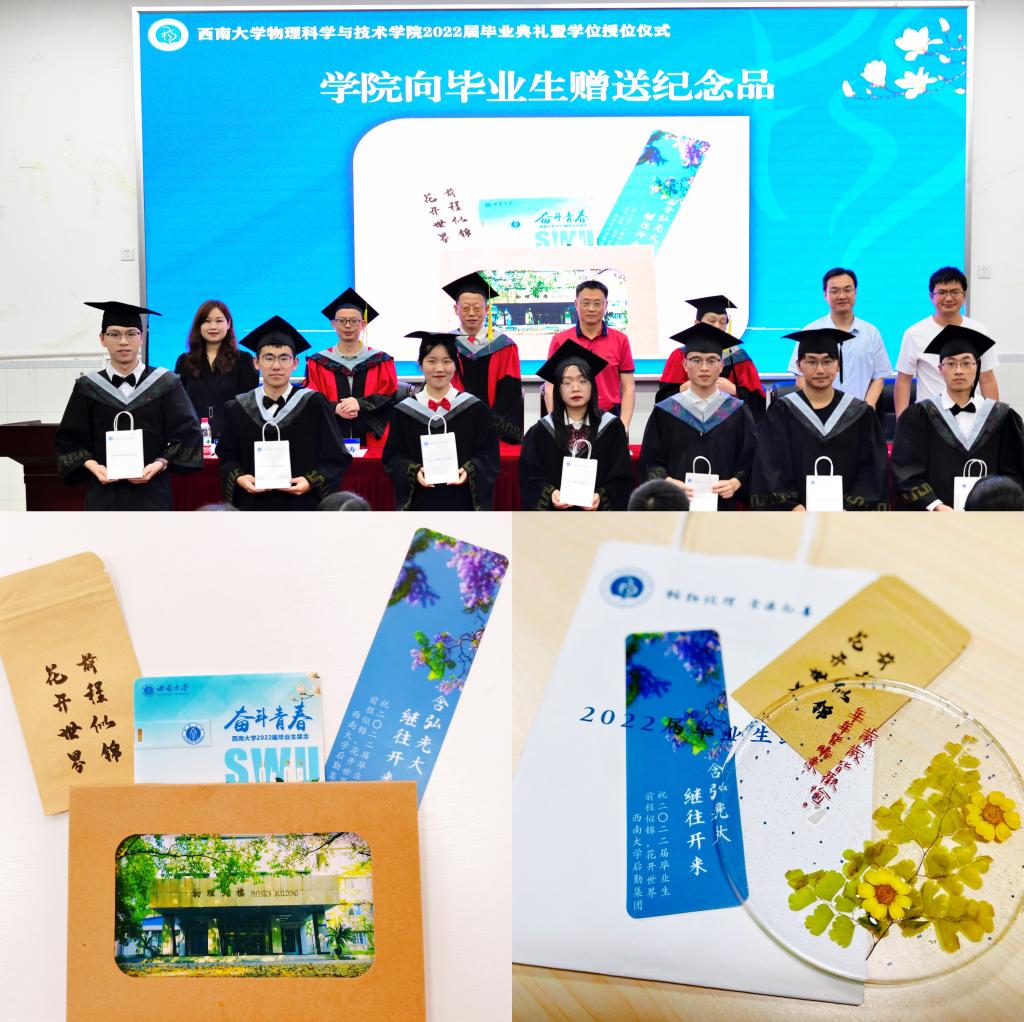 随后,主席台就坐的领导老师与毕业生互赠毕业纪念礼物,公司精心准备了格桑花种、书记经理签名的额公司风景明信片。“格桑”是“美好时光”或“幸福”的意思。今夏校园处处格桑花开,与蓝花楹交相辉映,这其中还有毕业生党员同志亲手种下的成果。公司与后勤集团携手将格桑花种赠予毕业生们,之前后勤集团党委还向全体毕业生党员赠送了用格桑花制作的杯垫。2022届本科毕业生从师生需求考虑准备了仪容镜相赠,“正衣冠、端品行”,立志秉承公司正直、严谨的优良作风,行稳致远。