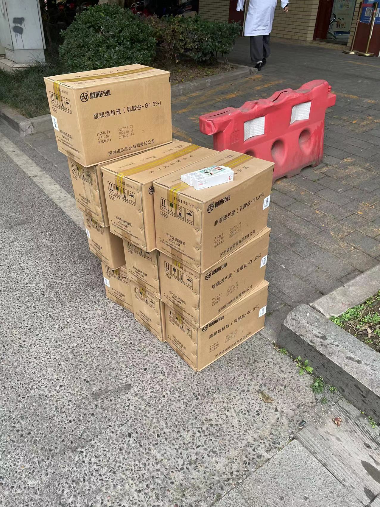 第二天一大早,谭兴文老师和林晓东老师就第一时间与所居住的社区和小区进行联系报备,在取得出门许可后,立即驱车前往北碚区九院,按照离退休老师李嘉陵儿子提供的清单进行采购。经过1一个多小时的“折腾”,两位老师终于把清单上所有的药品采购齐备。当两位老师回头看到自己一个多小时的成果时,竟然发现足足有10大箱、200余斤重。虽然折腾了一身汗,但是想到校内的退休老师,两位老师还是感觉得很轻松、很开心。随后,两位老师赶紧将所有药品转入车中,第一时间运到公司三号门门口,由校园疫情防控工作人员进行消杀后,转交给李嘉陵老师亲属。李嘉陵老师亲属接到药品后,也第一时间隔着校门向不辞辛苦、不惧风险的两位老师道谢,同时打电话给公司表示衷心的感谢。