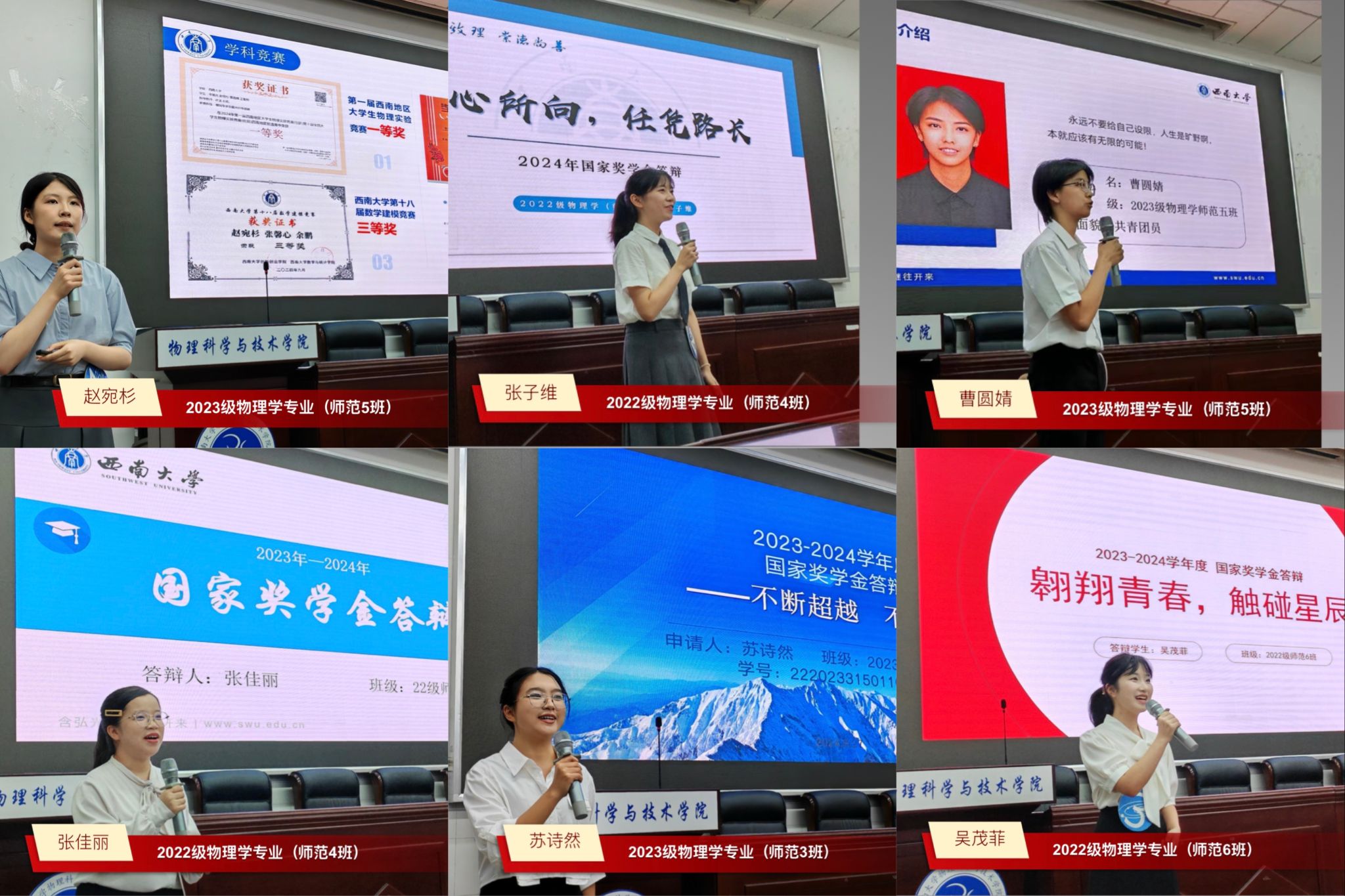 活动现场掌声雷动,氛围热烈。12名选手自信满满,汇报内容既有深入的专业研究展示,也有丰富的社会实践经历,充分展现了物院学子勤奋进取、卓越出众的专业能力和综合素养。