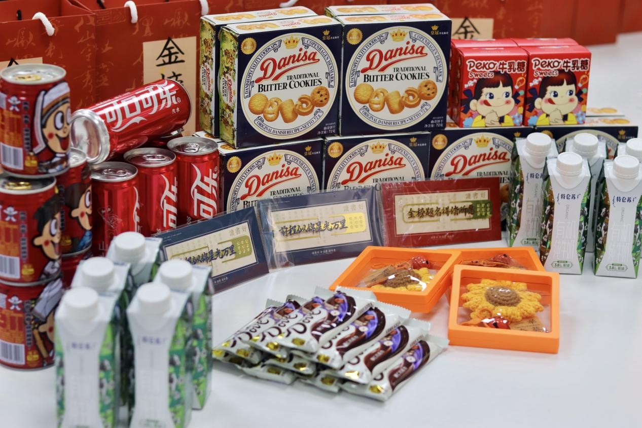 接着,参与慰问活动的全体老师为同学们逐一赠送了公司精心筹备的加油能量礼包,其中包含刻有名字的专属可乐、寓意 “一举夺魁” 的钥匙扣、美味小食、营养牛奶以及饱含深意的手写祝福卡。