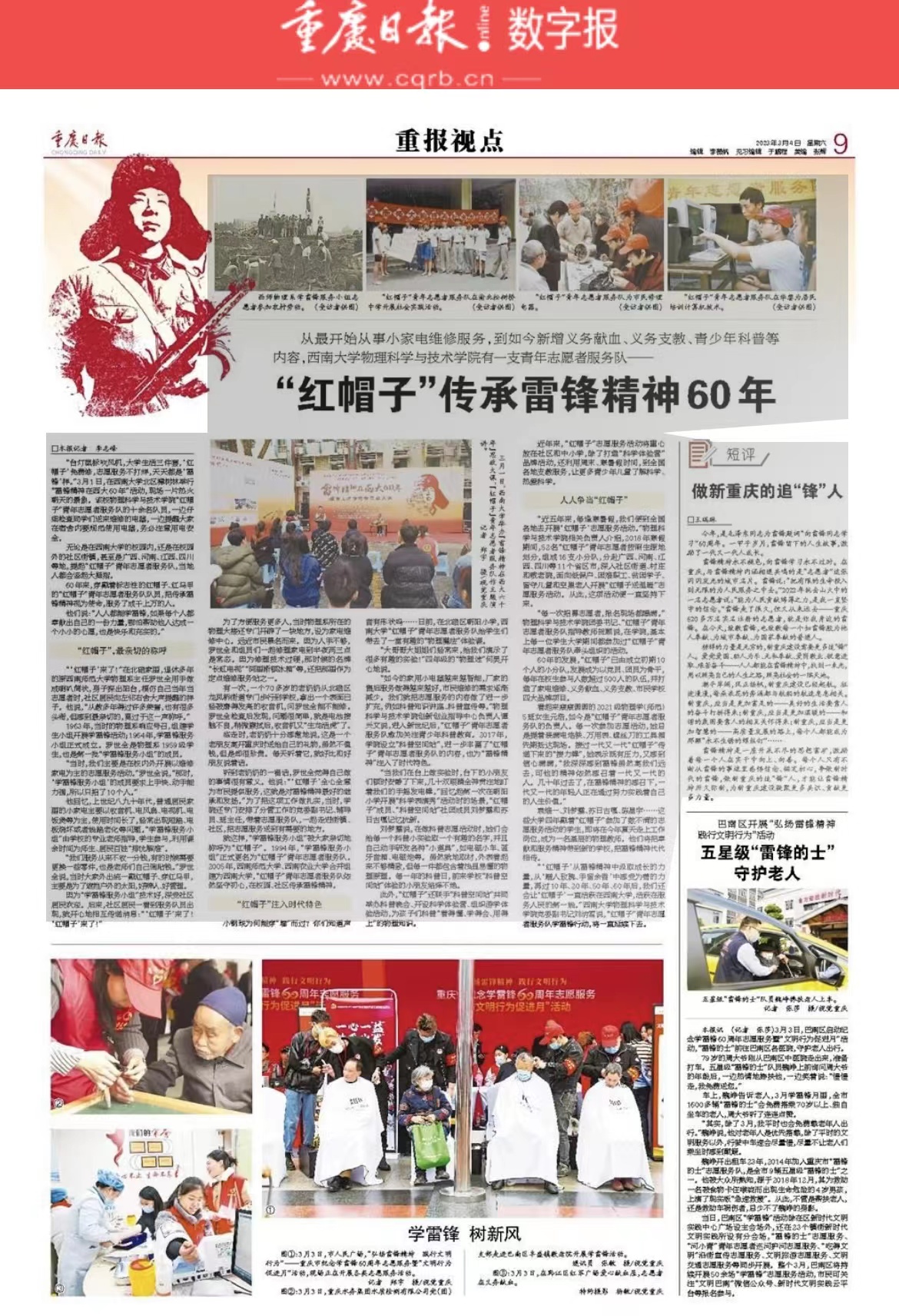 “一团火的热情真诚、一滴水的博爱宽容、一颗钉的勤奋钻研、一块砖的朴实坚韧、一片叶的感恩奉献”,60年来公司“红帽子”志愿者服务团队用一个个具体行动学习践行雷锋精神,书写了一个个鲜活的学雷锋故事,获得了重庆日报长篇专题报道宣传——《“红帽子”传承雷锋精神60年》,以下为全文报道。