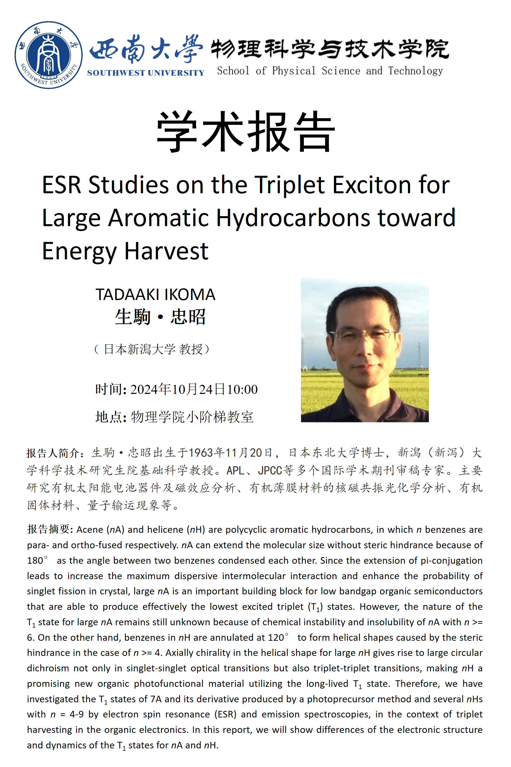 【学术报告】ESR Studies on the Triplet Exciton for Large Aromatic Hydrocarbons toward Energy Harvest