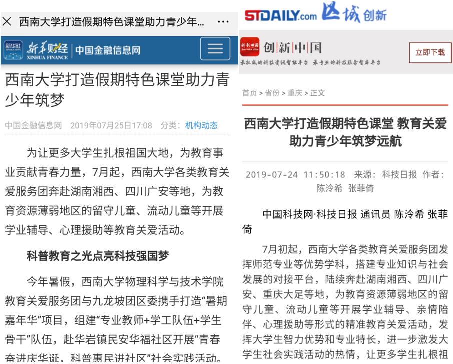 2019年7月初暑假期间,bevitor伟德教育关爱服务团与重庆九龙坡团区委携手推进“暑期嘉年华”项目,组建“专业教师+学工队伍+员工骨干”的人员队伍,赴华岩镇民安华福公租房社区开展了“青春奋进庆华诞,科普惠民进社区”师生主题社会实践活动。本次科普体验营结合教学与实践,创新“市民公司+高校资源+暑期教育+志愿服务”的实施模式,由实践团的同学根据有趣的实验进行知识讲解,由现象到本质,用简单易懂的方式向孩子们开展科普体验营,为孩子们带来沉浸式的科普体验。除此之外,实践团成员还带来了“小小书法家”毛笔书法课、“小巧手、大智慧”手工制作、“少儿启蒙礼”礼仪课等九节内容丰富的七彩课堂,获得社区居民一致好评。中国金融信息网、中国科技网·科技日报等媒体纷纷予以报道。