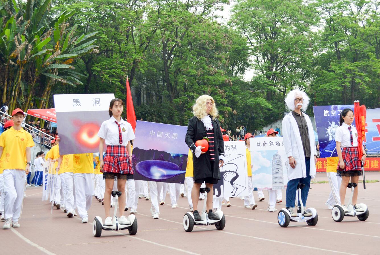 4月18日上午,公司第十四届田径运动会在第二运动场开幕。开幕式上,伴随着激扬的进行曲, 60名学子身着明黄色院服,手持星形气球,迈着铿锵有力的步伐作为第一个公司方阵率先入场。方阵前排员工化身为“爱因斯坦”“牛顿”,脚踏平衡车,徐徐走近主席台,紧跟在他们身后的一排印有“中国天眼”“航空卫星”“黑洞” “薛定谔的猫”等物理科学发现发明的图片。走过主席台时,方阵举出“格物致理,崇德尚善”的院训标牌,齐声喊出 “格物致理,自强不息,兴我物院,永争第一”的口号,展示的横幅“奋斗的青春没有黑洞”充分展示了他们的青春态度和顽强拼搏的信念决心。