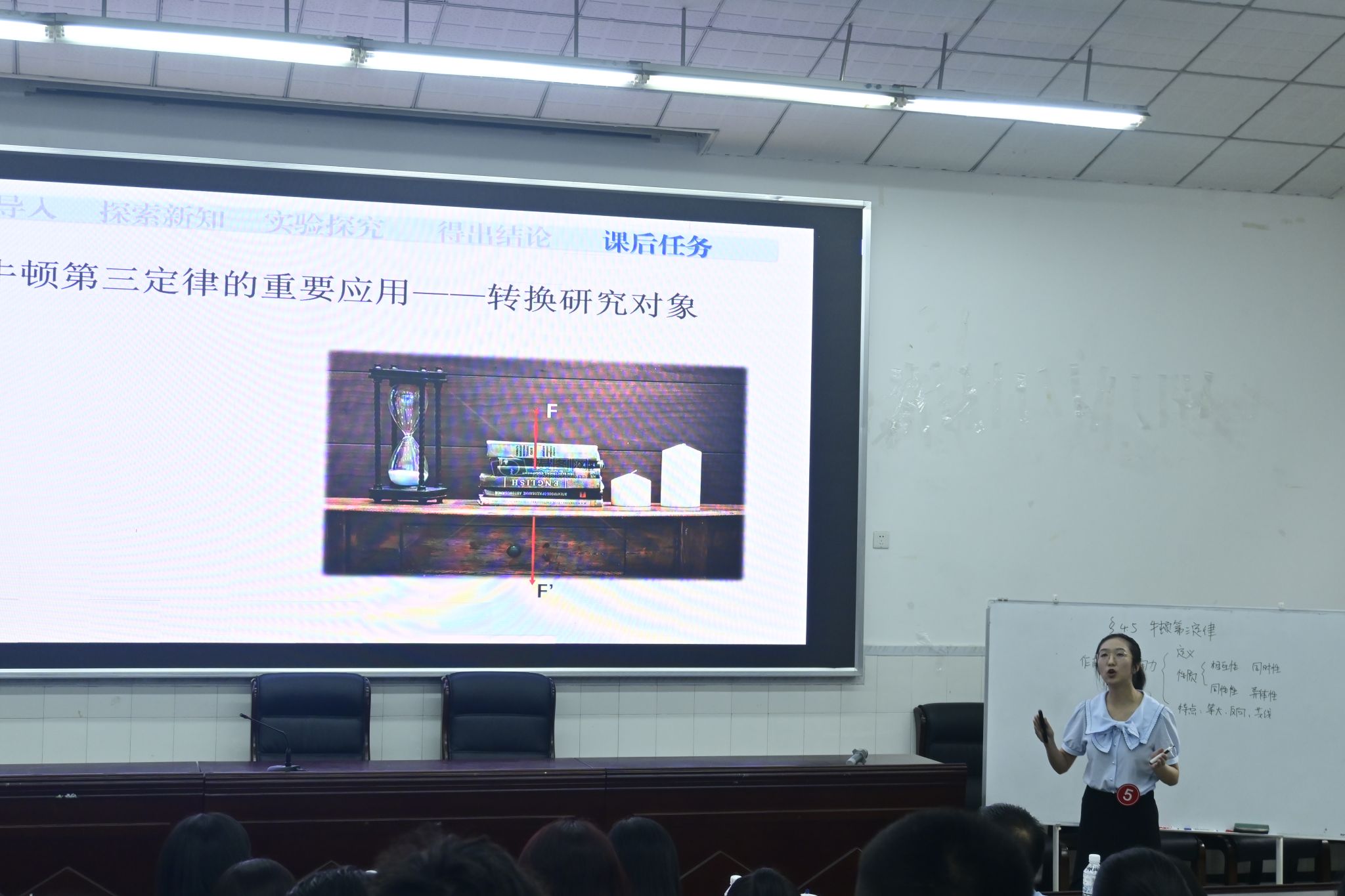 五号选手何瑶逸讲授的课题是《牛顿第三定律》。她用掰手腕、手拉弹簧、书与桌面、地球与人造卫星等例子引发同学们思考,讲授了作用力和反作用力之间的关系。