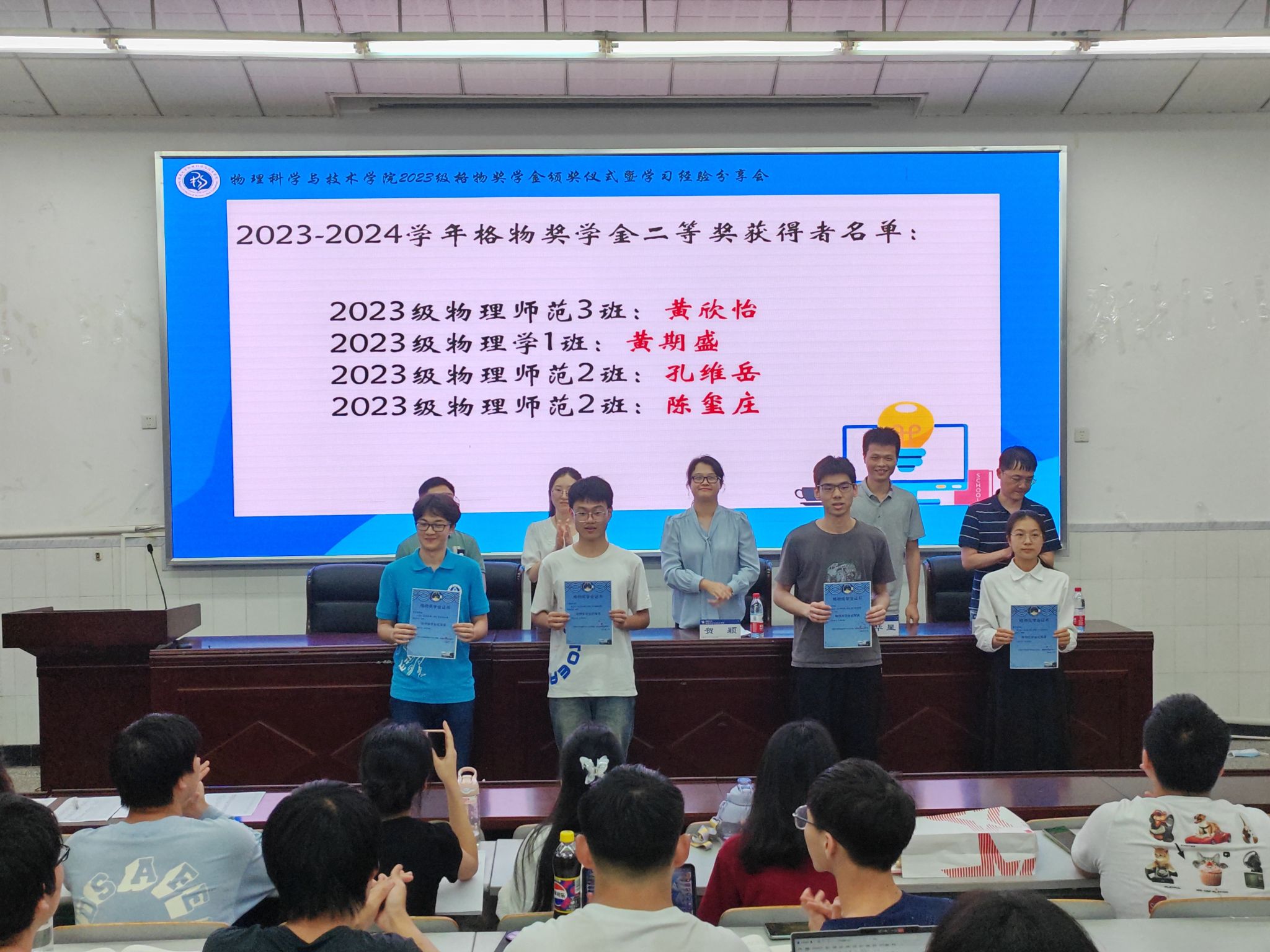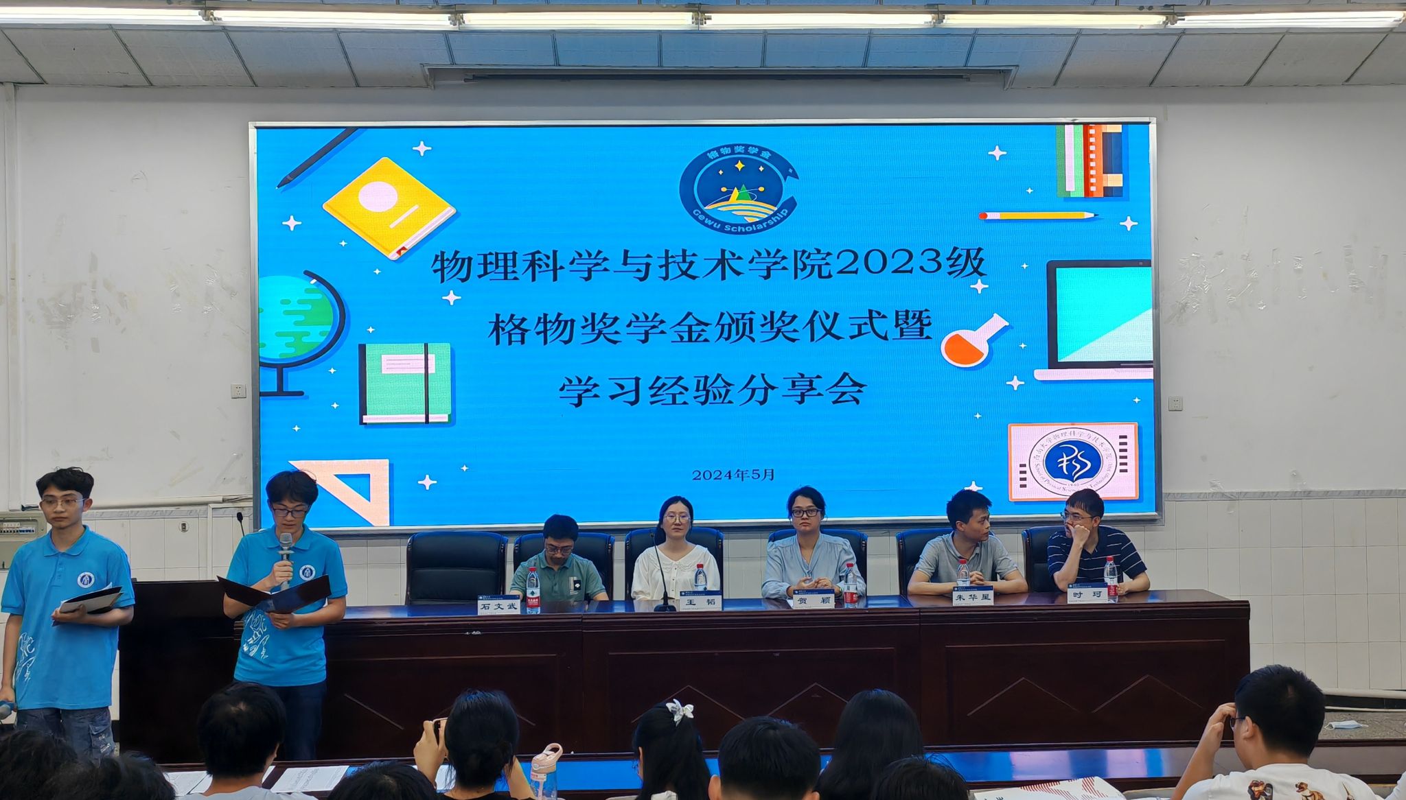 为进一步加强学风建设,鼓励员工刻苦学习,全面发展,522日下午17:00,公司在大阶梯教室举办2023格物奖学金颁奖仪式暨学习经验分享会。2023级辅导员贺颖,班主任时珂、王韬、朱华星、石文武和245名大一同学参加颁奖仪式,仪式由2023级黄梓恒和陈玺庄同学主持。