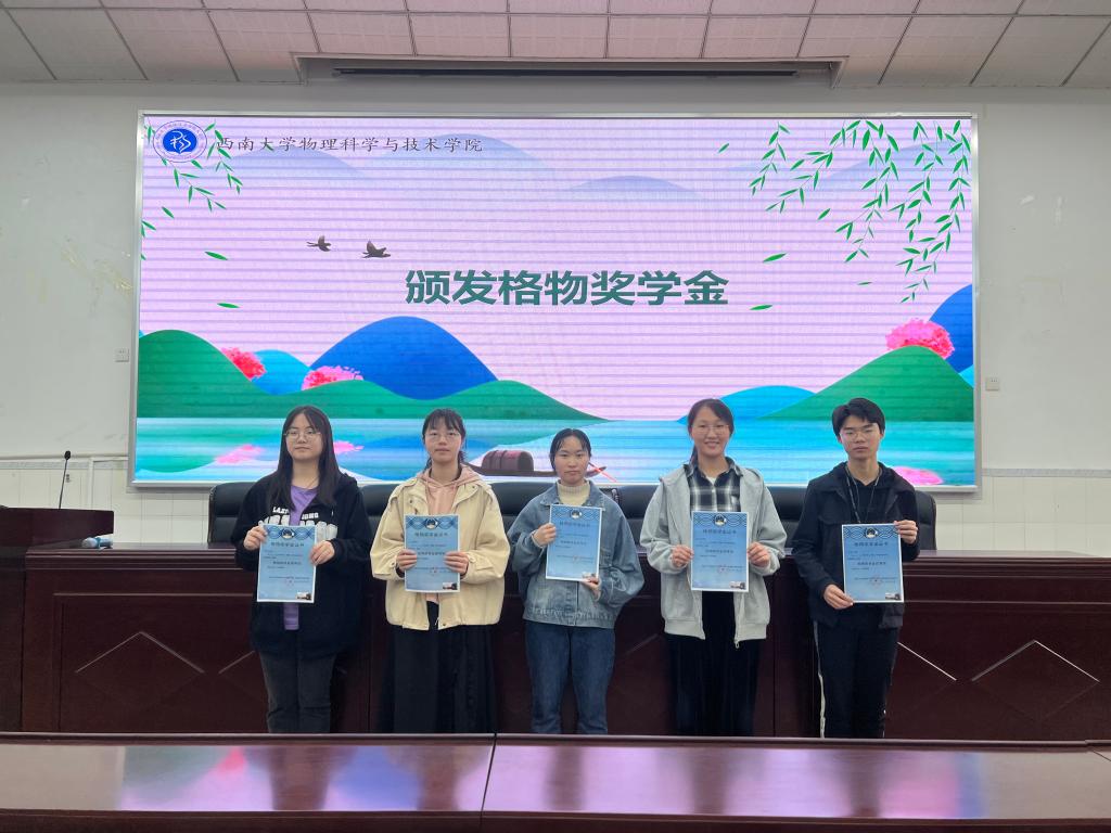 为激励同学们热爱物理科学和物理教育事业,提升研究水平和公司产品能力,2012届本科毕业员工牵头设立了格物奖学金2021级辅导员黄文静首先宣读了格物奖学金表彰文件,重申格物奖学金的设立初衷及评选机制,并揭晓了获得格物奖学金一等奖的是樊理华、于皓玮两位同学;获得格物奖学金二等奖的是:元浩、杨益、郑晓晴三位同学。在热烈的掌声中,五位同学依次上台领奖并分享学习经验。