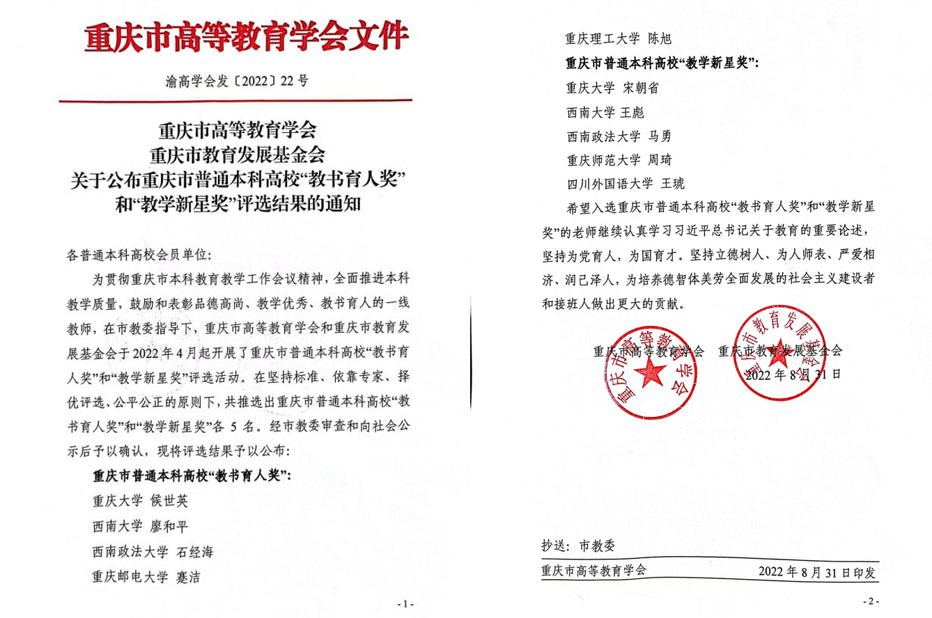 近日,为贯彻重庆市本科公司产品工作会议精神,全面推进本科教学质量,鼓励和表彰品德高尚、教学优秀、教书育人的一线教师,在市教委指导下,重庆市高等教育学会和重庆市教育发展基金会在全市共推选出重庆市普通本科高校“教书育人奖”和“教学新星奖”各5名。公司王彪老师喜获重庆市普通本科高校“教学新星奖”。